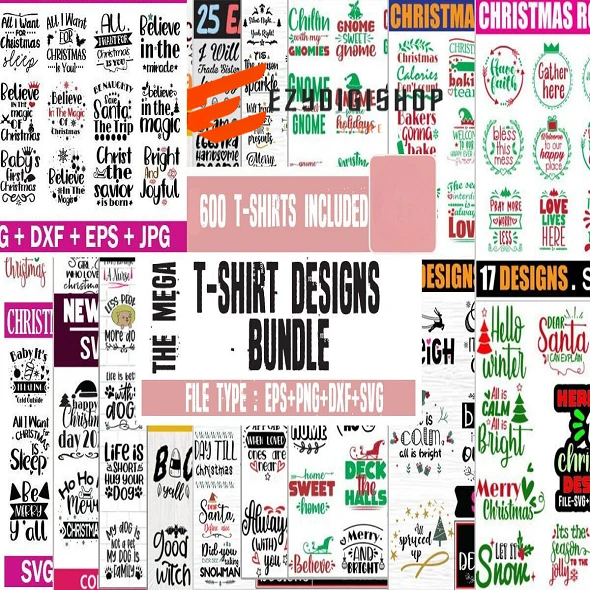 Elevate your holiday apparel with the EZYDIGISHOP Mega T-Shirt Designs Bundle. This extensive collection includes 600 high-quality T-shirt designs, perfect for the festive season. Featuring a variety of Christmas and holiday-themed designs such as "Believe in the magic," "Merry Christmas," "Deck the halls," and "Santa's favorite," this bundle offers a wide range of colorful and creative options. Each design is available in EPS, PNG, DXF, and SVG formats, ensuring compatibility with your favorite design software and easy customization for your apparel needs.